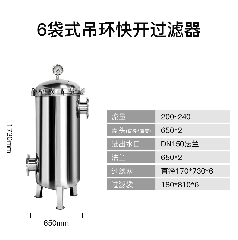 标准多袋式过滤器,适用于大流量过滤,可以容纳更多杂质,也适用于希望使用较长时间后方才更换滤袋的场合。单机小流量50吨/小时。日常维护非常便捷。