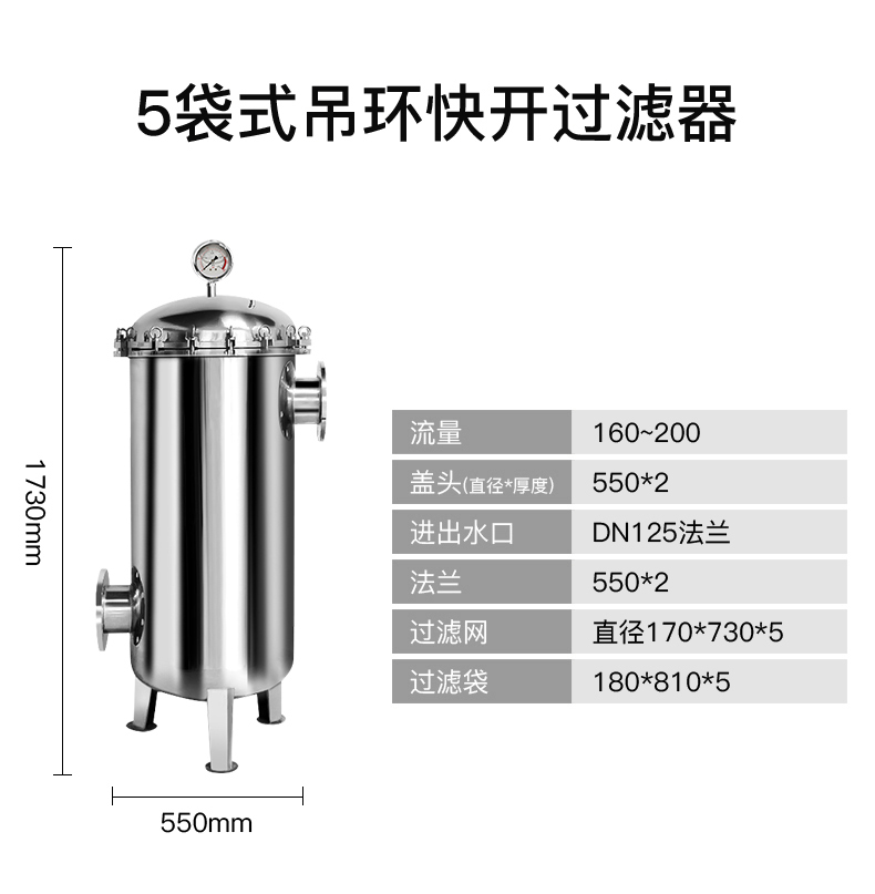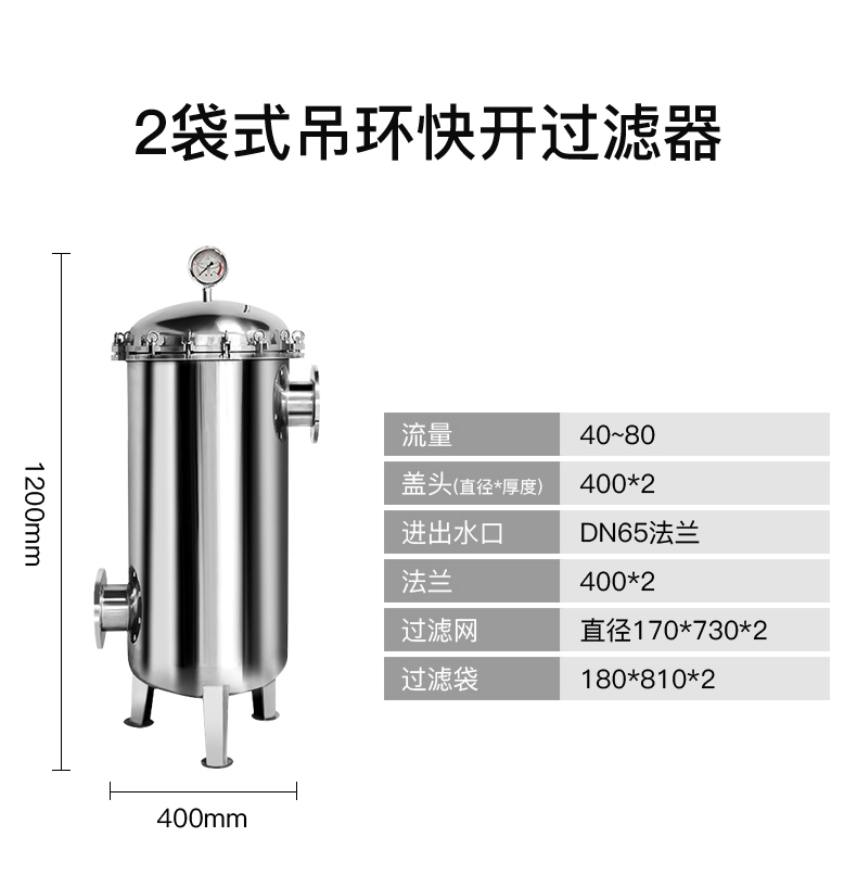 内外镜面抛光或喷砂亚光处理。多袋式过滤器、PP(多袋)碳钢多袋式过滤器主要用于过滤水,饮料,化学液体中的杂质,常规滤袋类型有1#、2#,多袋式过滤器内有不锈钢滤篮作为支撑,这样的过滤器过滤面积大,过滤效果好,并且带摇臂、吊环螺栓的打开方式很方便,有效降低了大流量过滤的成本。水流量可以达到10m²/h到1080m²/h -